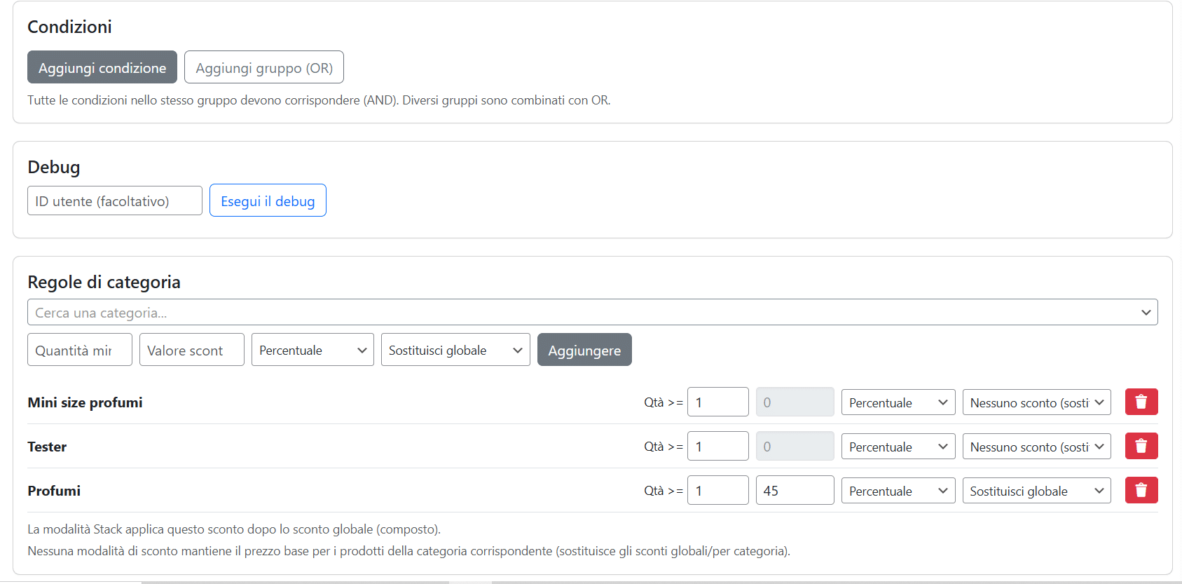 Modalità categoria: Replace global, Stack on global, No discount (override).