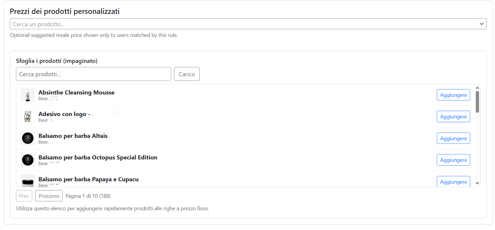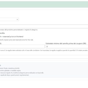 Imposta prezzi personalizzati, sconti globali e per categoria, esclusioni, condizioni avanzate e priorità regole. In frontend puoi mostrare prezzo pieno barrato + prezzo riservato e il prezzo consigliato di rivendita.